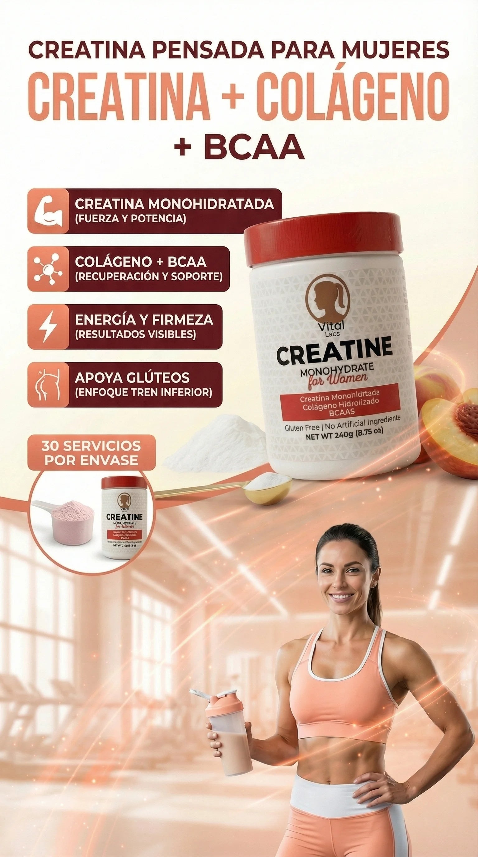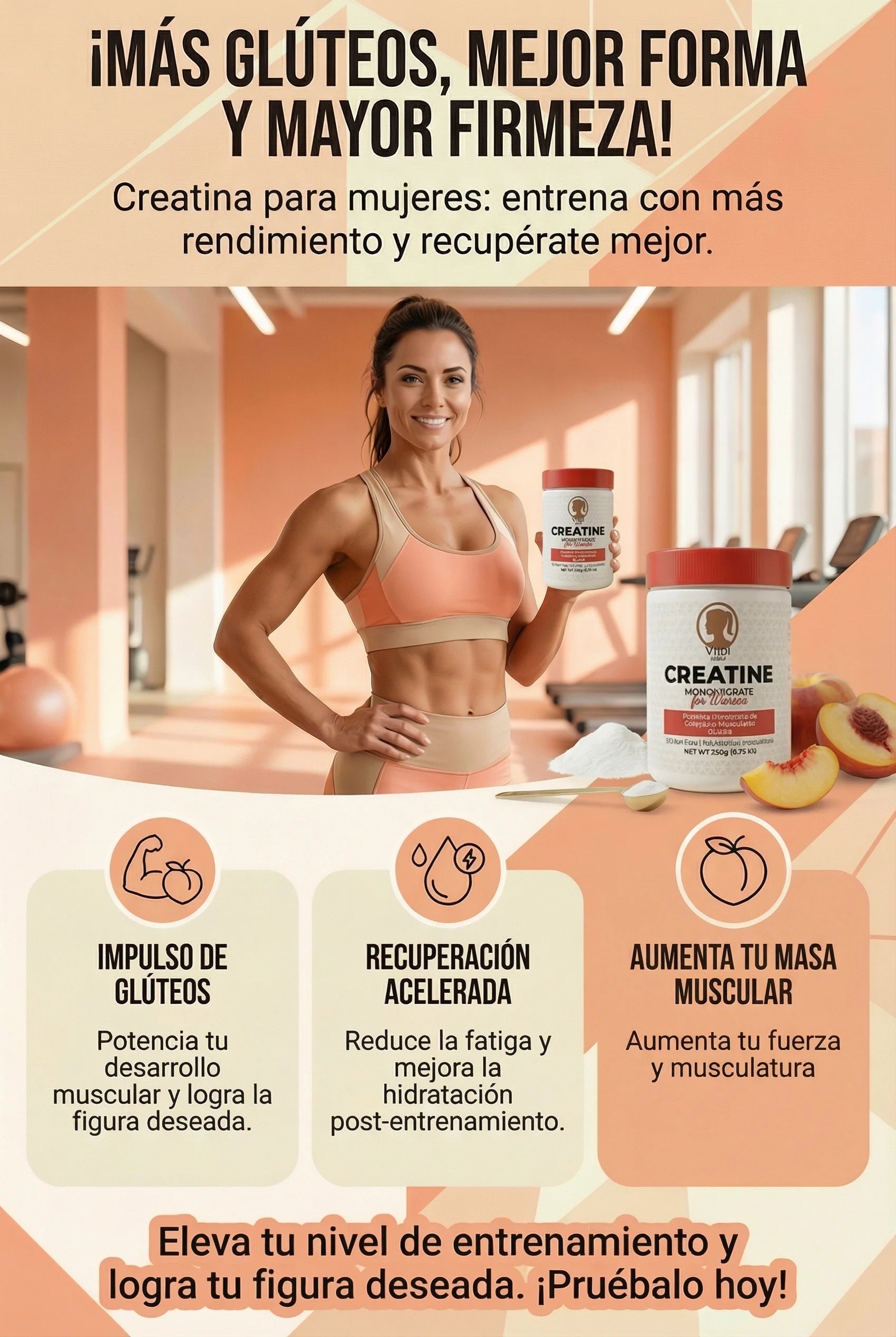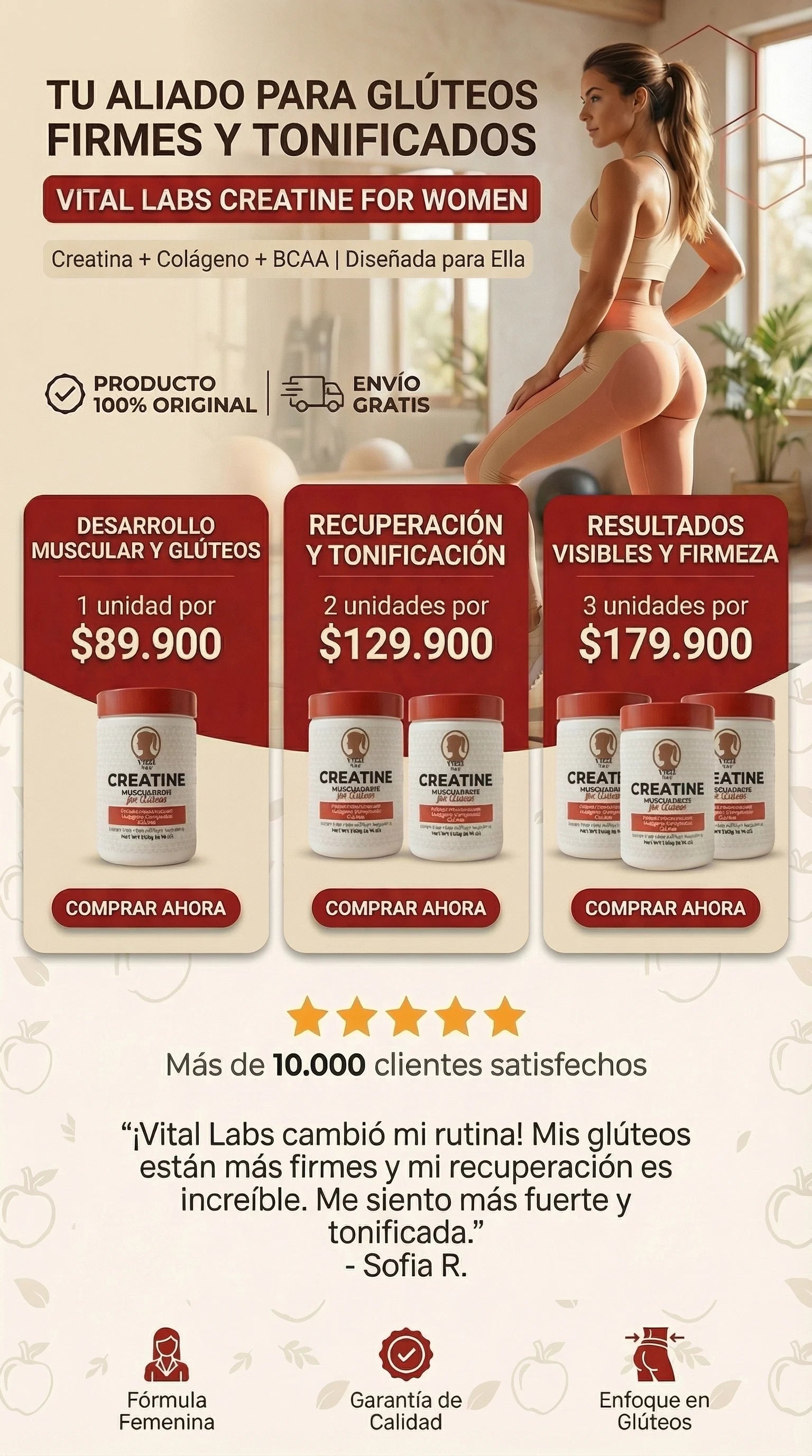 Muchas clientas reportan mejor rendimiento y firmeza en 2–8 semanas con entrenamiento de glúteos constante y buena hidratación. Los resultados varían.