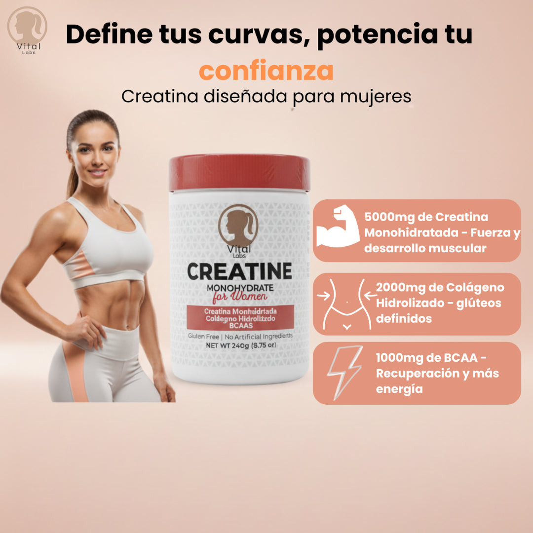 Nuestra fórmula está pensada para el cuerpo femenino: 5,000 mg de creatina monohidratada con colágeno hidrolizado y BCAA para impulsar fuerza, glúteos firmes y una mejor recuperación.